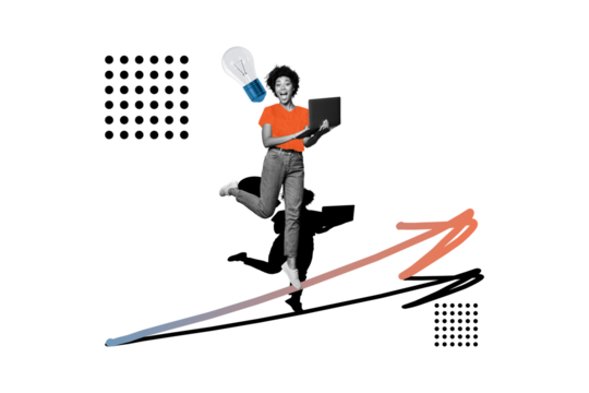 Composite photo collage of excited happy american girl hold macbook device light bulb idea concept finding isolated on painted background