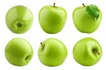 Green fresh apple with splashes of water on transparent background