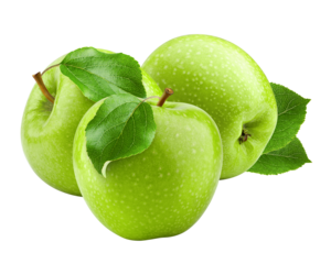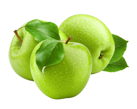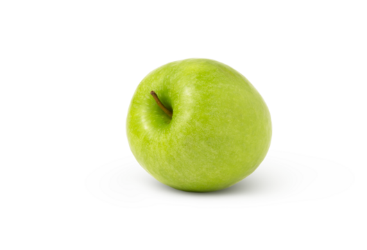 A vibrant green Granny Smith apple with a dark brown stem and bright leaf, impeccably placed on a transparent seamless background with soft studio light, emphasizing pure natural freshness