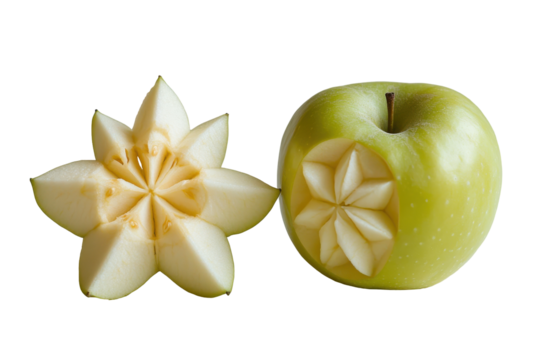 Green apple carved into a flower shape isolated on transparent background. Half cut star shaped apple next to whole fruit isolated on white background.