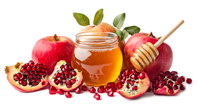 A jar of honey sits on a table with a bowl of fruit, including apples and pomegranates
