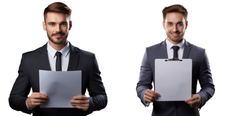 Job applicant holds resume on clipboard, isolated on transparent background.