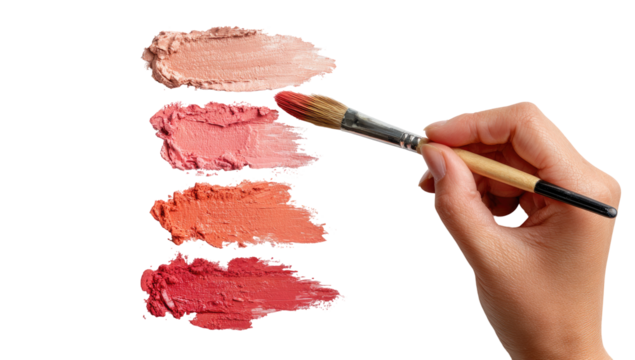 Close-up of a woman applying blush with a makeup brush to enhance her beauty against a white background.