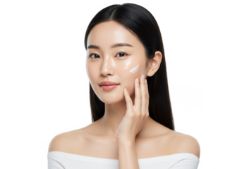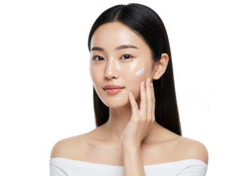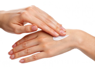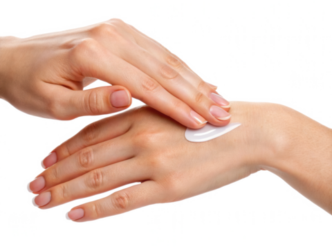Hands applying white cream on wrist skin for moisturizing isolated on transparent background