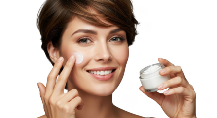 Close up beauty portrait of a beautiful woman applying face cream and looking away isolated over transparent background