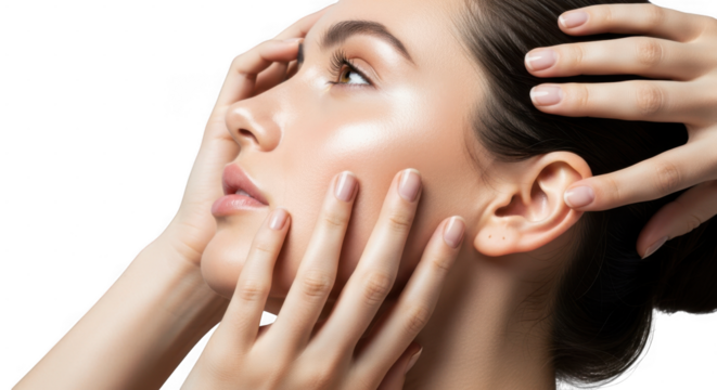Woman applying skincare or makeup on face with hands, isolated on transparent background