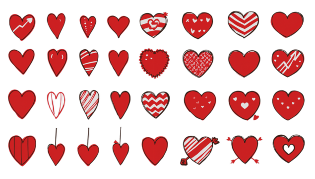 A diverse collection of stylized red heart illustrations, each distinctively hand-drawn with various patterns and textures, perfect for conveying love, romance, and heartfelt emotions