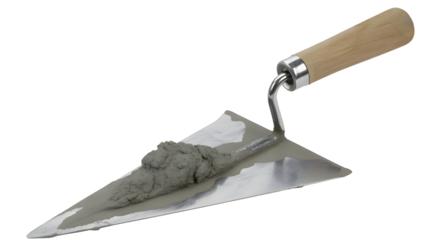 Professional masonry trowel loaded with wet cement, ready for construction and home improvement projects