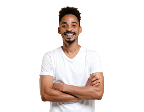 Smiling man with crossed arms wearing a white tee against a black backdrop, radiating warmth and approachability