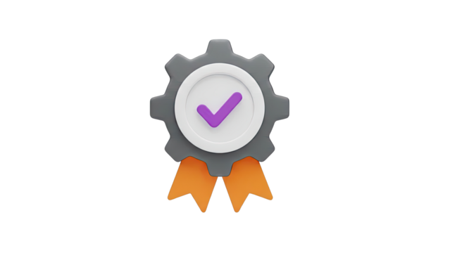 3D Icon of a Gear Badge with a Checkmark and Ribbons
