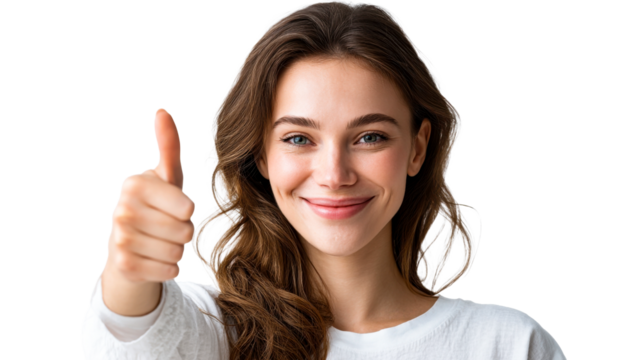 Young woman with brown hair giving a confident thumbs up gesture and smiling while wearing a white top, perfect for representing approval or success in marketing and online content.