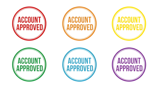 Six colorful circular rubber stamps confirming account approval on transparent background