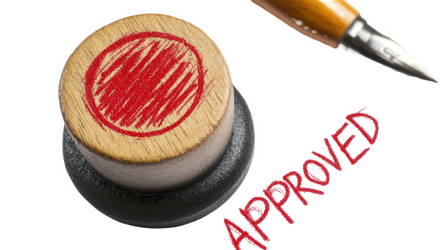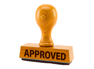 Wooden stamp with red approved mark and paintbrush shot on transparent background