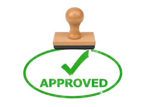 Wooden rubber stamp with a green ink impression of a check mark and the word APPROVED within an oval shape on a transparent background signifying confirmation and validation
