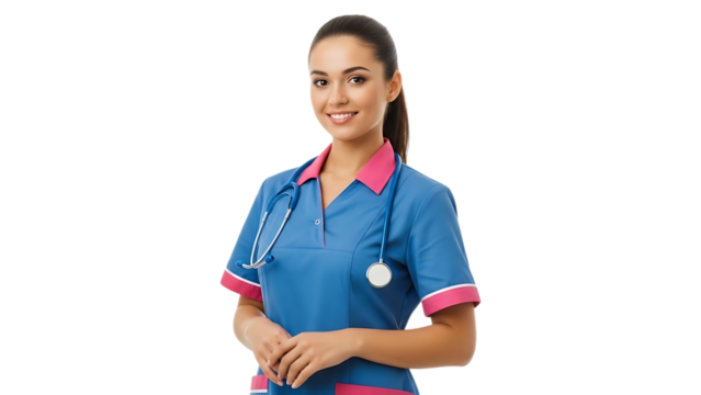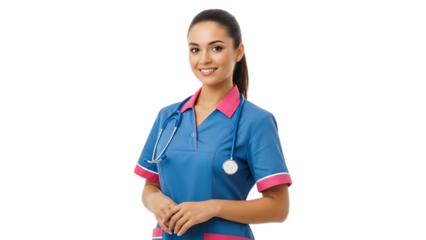 Smiling young nurse in blue uniform with pink accents and stethoscope around her neck standing alone