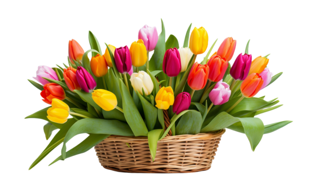 Bouquet of beautiful tulips in wicker basket on transparent background.