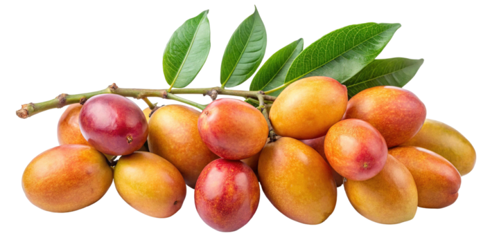 A vibrant cluster of ripe red and orange pluots with green leaves isolated on transparent background