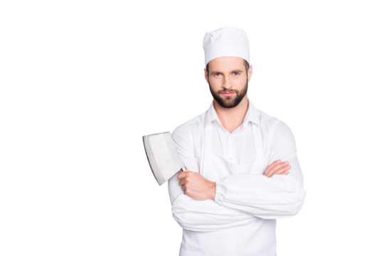 Portrait of handsome attractive butcher in beret having his arms crossed holding metal cleaver looking at camera isolated on grey background