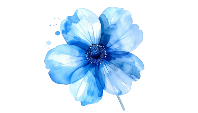 A vibrant watercolor flower illustration in varying shades of blue, set against a transparent background