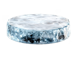 A round slice of ice with light blue tones sits on transparent background