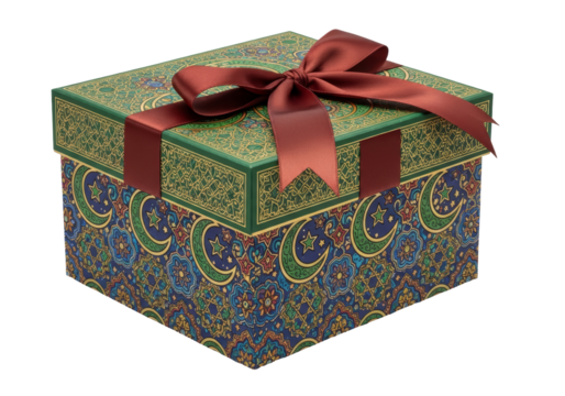 ornate patterned gift box with burgundy ribbon for ramadan eid mubarak