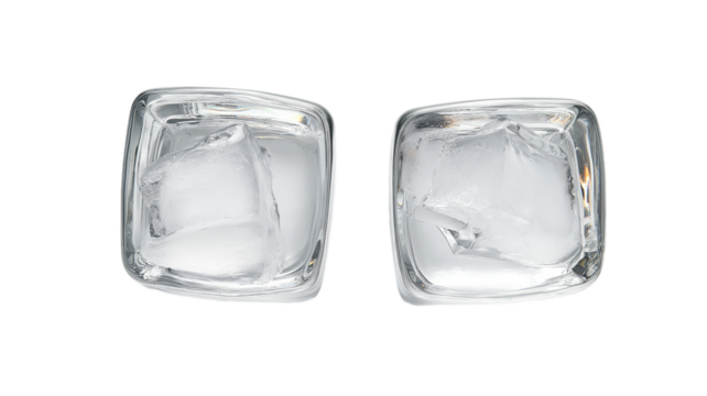 Four clear ice cubes in a row, isolated on a white background. PNG transparent.