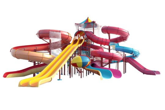 Water Slide: A vibrant, inviting water slide structure, ready for thrilling descents. The playful design and bold colors suggest endless aquatic fun and excitement.