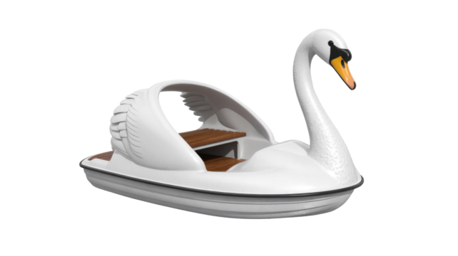 This image features a white swan pedal boat with wooden seats, designed for aquatic recreation and leisurely rides. background removed