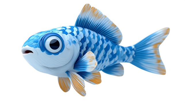 Close up of a vibrant yellow fish with purple fins on a in a studio shot style on transparent background