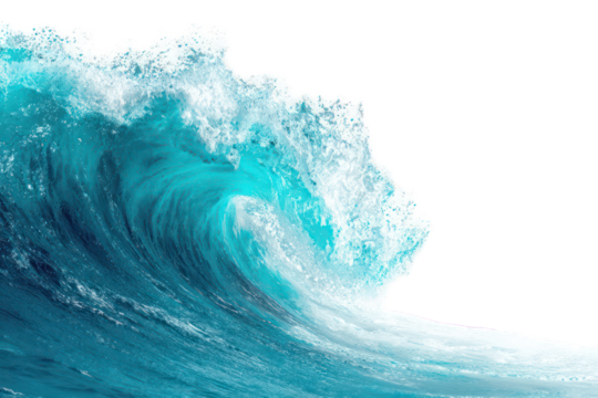 a powerful blue wave crashing against a transparent background. with splashes of water