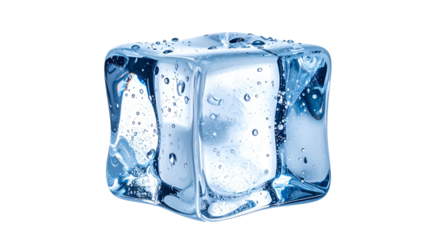 Isolated, close-up view of a clear ice cube with water droplets, against a black background