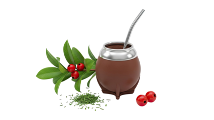 Mate gourd with yerba mate, bombilla, leaves, and berries