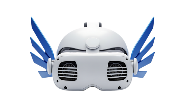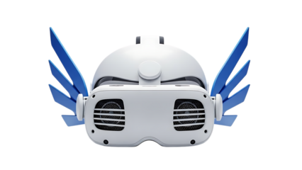 White robotic helmet with blue wings isolated on transparent background