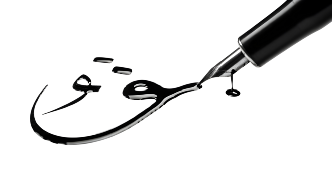 Black Fountain Pen Writing Arabic Calligraphy with Dripping Ink on White Background