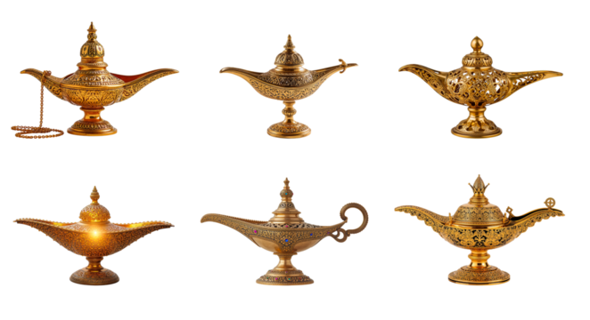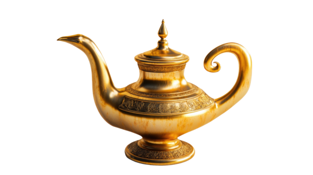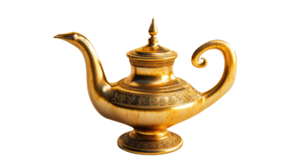 Mystical Arabian Genie Lamp with Golden Shine Transparent Background.