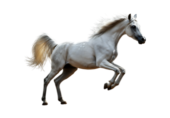Happy arabian white horse isolated  as png. Stallion with long mane galloping
