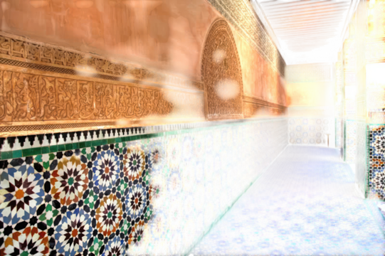 Intricate islamic geometric tile patterns and arabic calligraphy adorn the walls of a sunlit corridor, showcasing traditional moroccan architecture and design isolated on transparent background