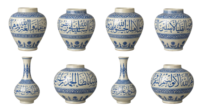 Antique Islamic Ceramic Vases with Blue Arabic Calligraphy Decorations