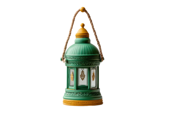PNG Traditional green lantern with intricate patterns and rope handle