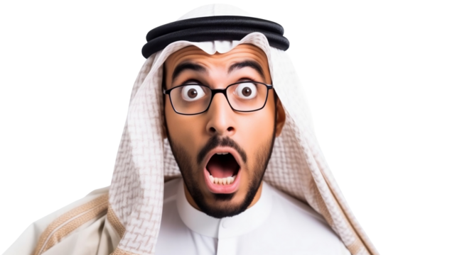 Surprised Arab middle eastern Saudi man in traditional. Excited fun man. Isolated on Transparent background.