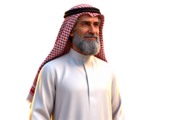 Portrait of a smiling, handsome saudi man wearing traditional clothes, isolated on transparent background.