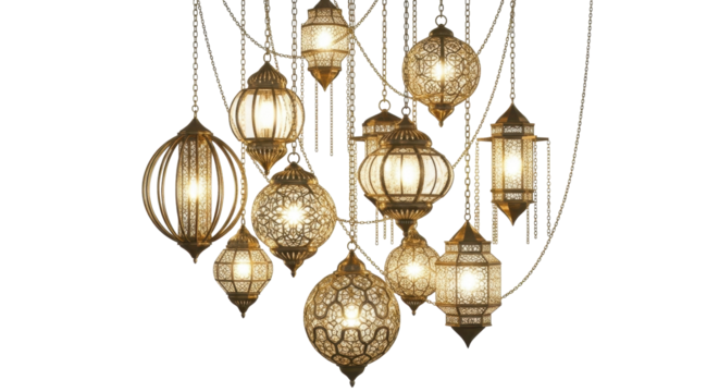 Collection of ornate ramadan lanterns isolated on transparent background, showcasing the intricate designs and warm glow of these traditional islamic decorations