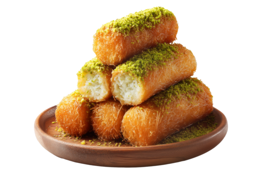 Traditional Middle Eastern Kunafa dessert cubes filled with cream and topped with ground pistachios on wooden plate isolated on white transparent background, concept of traditional sweets