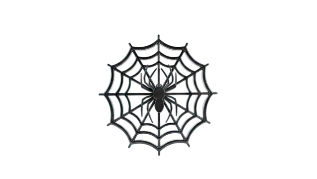 Black spider hanging on a single silk thread, isolated on transparent alpha channel background