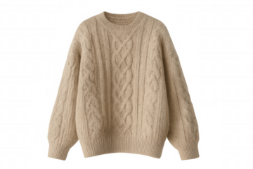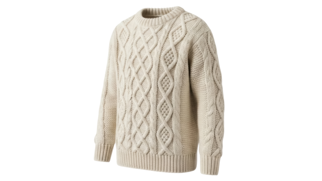 Beige cable knit wool sweater with intricate aran pattern, warm winter clothing for comfort and style, transparent background