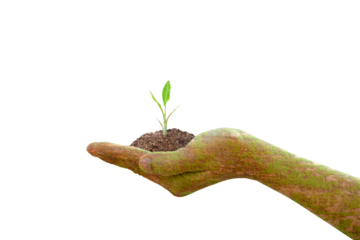 Man holding soil with green tree on isolated background. Transparent background. PNG background.