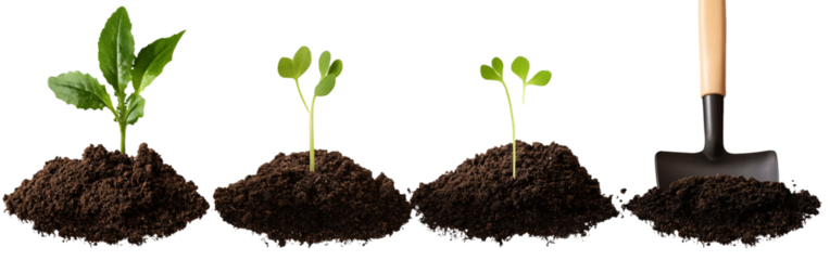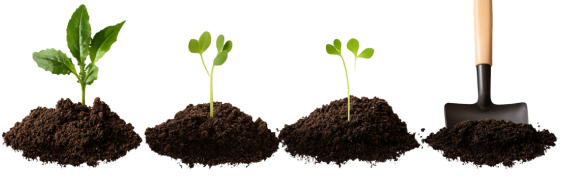 Set of gardening tools with soil, plants, and a trowel, isolated on a transparent background