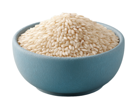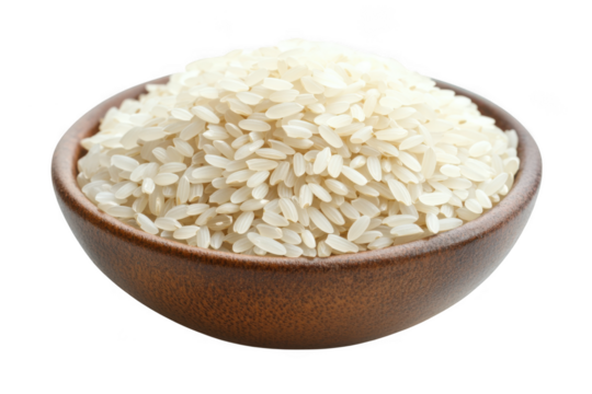 Bowl of white rice grains, uncooked rice, asian cuisine, staple food, carbohydrates, healthy eating, rice bowl isolated on transparent background