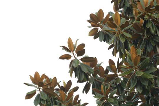 lush magnolia tree branches with green and brown leaves . Isolated on transparent background, png