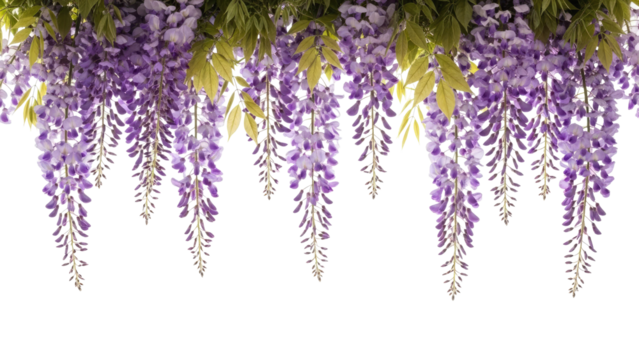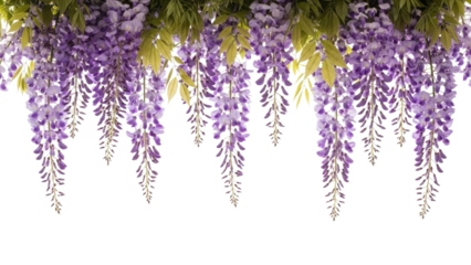 Vibrant purple wisteria flowers hanging gracefully creating a beautiful floral border.
